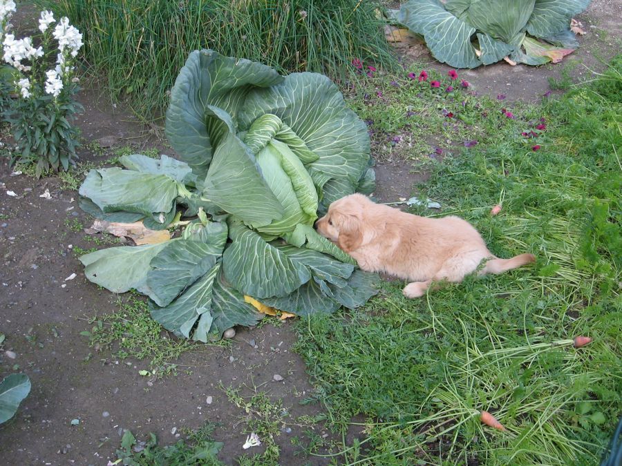 Here is the new puppy, Hunter II, eating a large cabbage. (Photo: Mom)